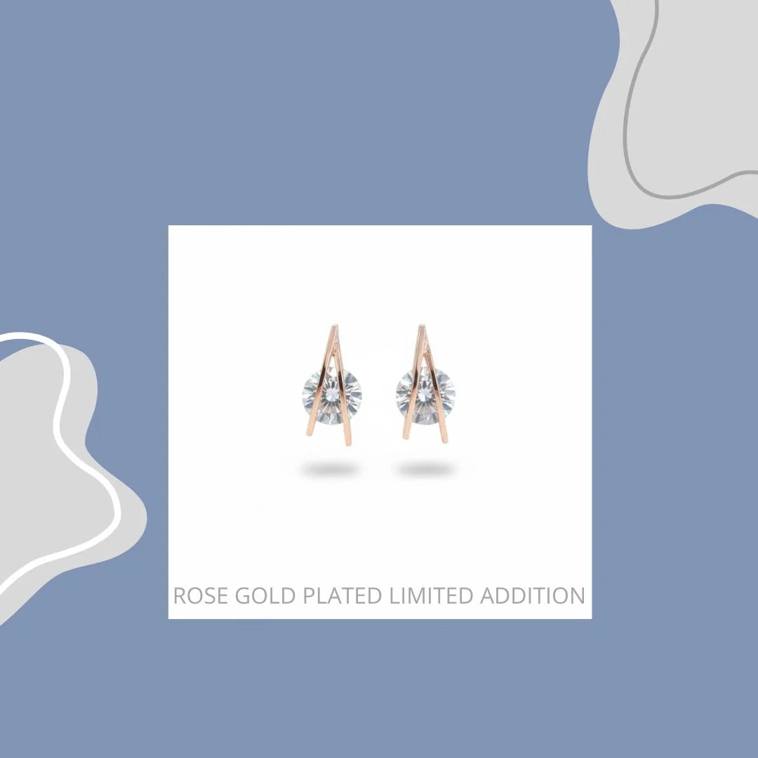 Rose gold plated CZ stud earrings for women and girls, featuring a minimal geometric triangle frame holding a sparkling round CZ stone.